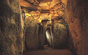 Above the entrance passage is a 'roof-box', which precisely aligns wit the rising sun at the winter solstice of 21 December, so that the rays touch the ground at the very centre of the tomb for about 20 minutes. Many of the upright stones along the walls of the 19m (62ft) passage, which follows the rise of the hill, are richly decorated. The cruciform chamber inside the mound measures 6.5 x 6.2m (21ft 6in x17ft), has three recesses and is roofed by a magnificent corbelled roof reaching to a height of 6m (20ft) above the floor. In the recesses there arethree massive stone basins which presumably had some ritual use. Excavations in the central chamber produced the remains of two burials and at least three cremated bodies as well as seven marbles, four pendants, two beads, a flint flake, a bone chisel and fragments of several bone pins and points.