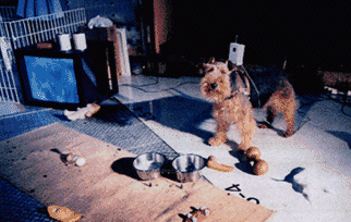 The contrast between an artist like William Wegman and Narumi's work is that it does not try to distort the investigations and experiences. Wegman prefers to display the animal/device from the point of view of the artist. Narumi's work foregrounds the animals perspective--when the dog has to deal with a new toy or a simple plastic bag moved by the wind, the dog is not sure about the livingness or the edibleness of what it finds in front of him. The viewer and the artist become a part of the the dog's desire and investigation of the world as a shared discovery--the world as the shared vision of the "canicula," of becoming animal.